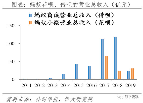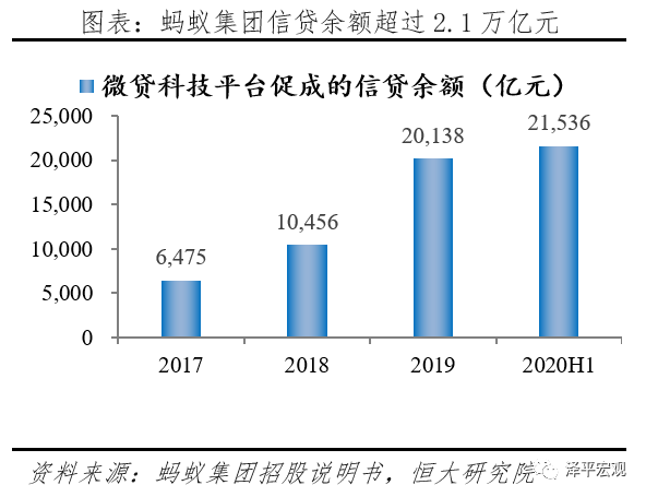 蚂蚁集团的互联网贷款包括2B和2C端,2B主要是网商银行的小微贷和助农贷等,2C端为消费贷蚂蚁花呗和现金贷蚂蚁借呗。截至2020年6月底,蚂蚁集团消费信贷余额为17320亿元,小微经营信贷余额为4217亿元,总计21356亿元,服务约5亿用户及超过2000万小微经营者。