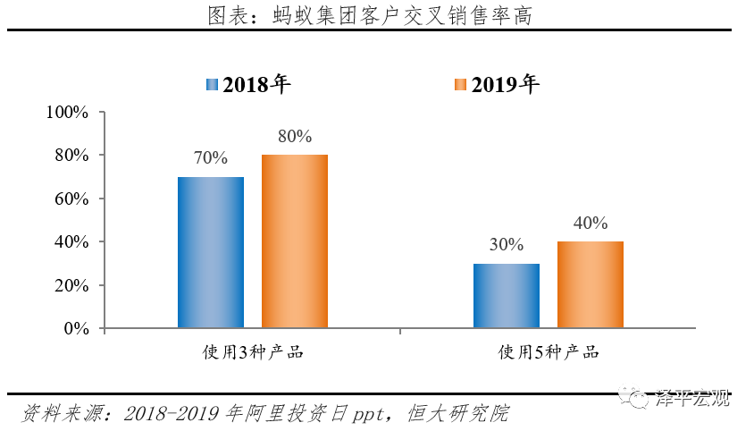 支付宝拥有超过十亿的年度活跃用户,通过多样化的生活场景增加客户粘性,实现交叉销售,为金融机构导流,蚂蚁仅收取技术服务费,不再承担金融产品本身风险。2018年同时使用三种以上蚂蚁集团产品的客户比重达到70%,同时使用五种以上产品的比重达到30%,2019年该比例分别提升至80%和40%,市场渗透率进一步提升。