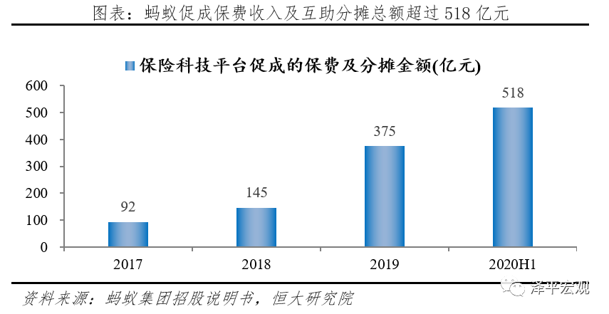 3)保险方面,主营合作普惠定制产品。蚂蚁保险商城以营销与保险公司合作定制产品为主,2018年,蚂蚁与中国人保合作推出“全民保”、“好医保”,2019年与国华人寿推出“健康福”等,产品均体现出低门槛、出入灵活且简单易懂的普惠特点。根据招股说明书,截至2020年6月,蚂蚁已经同约90家保险机构合作开展业务,促成保费收入及互助分摊总额超过518亿元,仅9%由国泰保险承保。