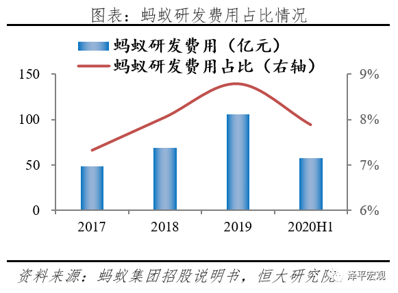 投入:蚂蚁集团不断加大金融技术创新投入,根据招股说明书披露,2019年集团研发费用高达106.05亿元,同比大幅增长53.6%,占总营业收入比重达到8.8%,截至2020年6月,蚂蚁集团技术人员共10646人,占总员工比重64%。