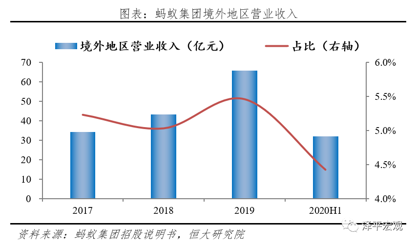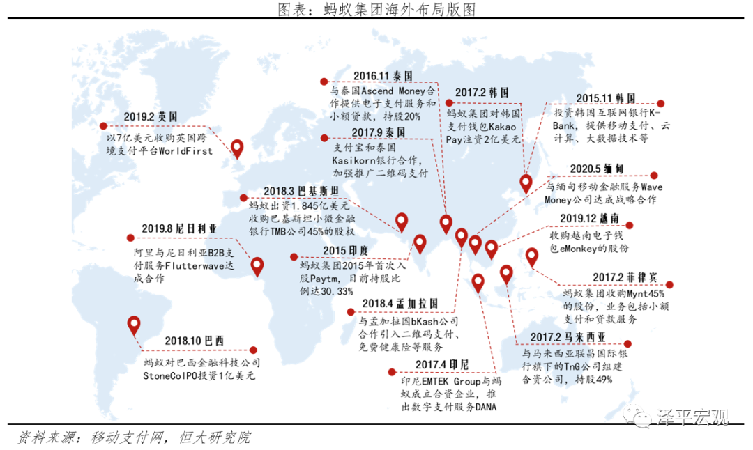 三是由点及面,蚂蚁集团依托以支付业务为先导,跟随阿里巴巴集团生态战略布局出海,延伸多元金融业态。蚂蚁集团海外布局试图复制支付宝在国内开创的“从场景到支付到金融”的发展路径,与阿里巴巴集团的国际化战略高度协同,例如2016年4月,阿里巴巴以10.2亿美元收购Lazada约54%的股权,同期蚂蚁金服宣布与Lazada旗下的在线支付工具HelloPay合并,后者将改名为“支付宝”,由此通过与阿里巴巴的应用场景绑定输出支付技术;2019年后蚂蚁集团开始从支付业务向多元金融转化,海外业务的深度进一步提升,例如2019年1月投资印尼消费分期公司Akulaku,2019年11月印度布局消费借贷产品Paytm Postpaid,2020年1月投资印度餐饮020企业Zomato等,开始从支付业务向零售行业及消费金融领域拓展。