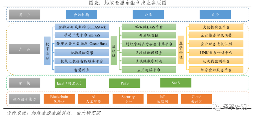 1)数字金融主要是定制化的云计算服务,具体包括金融分布式架构SOFAStack、移动开发平台mPaaS、分布式关系数据库OceanBase等模块,2015 年9月蚂蚁金融云正式发布,面向金融机构提供深度定制的行业云计算服务。2017年“双十一”蚂蚁数据库处理达到4200万次/秒,至2019年蚂蚁自研的金融级分布式关系数据库OceanBase创造了6100万次/秒的处理峰值新记录,根据国际事务处理性能委员会(TPC)披露, OceanBase数据库在被誉为“数据库领域世界杯”的TPC-C基准测试中,打破了由美国公司Oracle(甲骨文)保持了9年之久的世界记录,成为首个登顶该榜单的中国数据库产品。