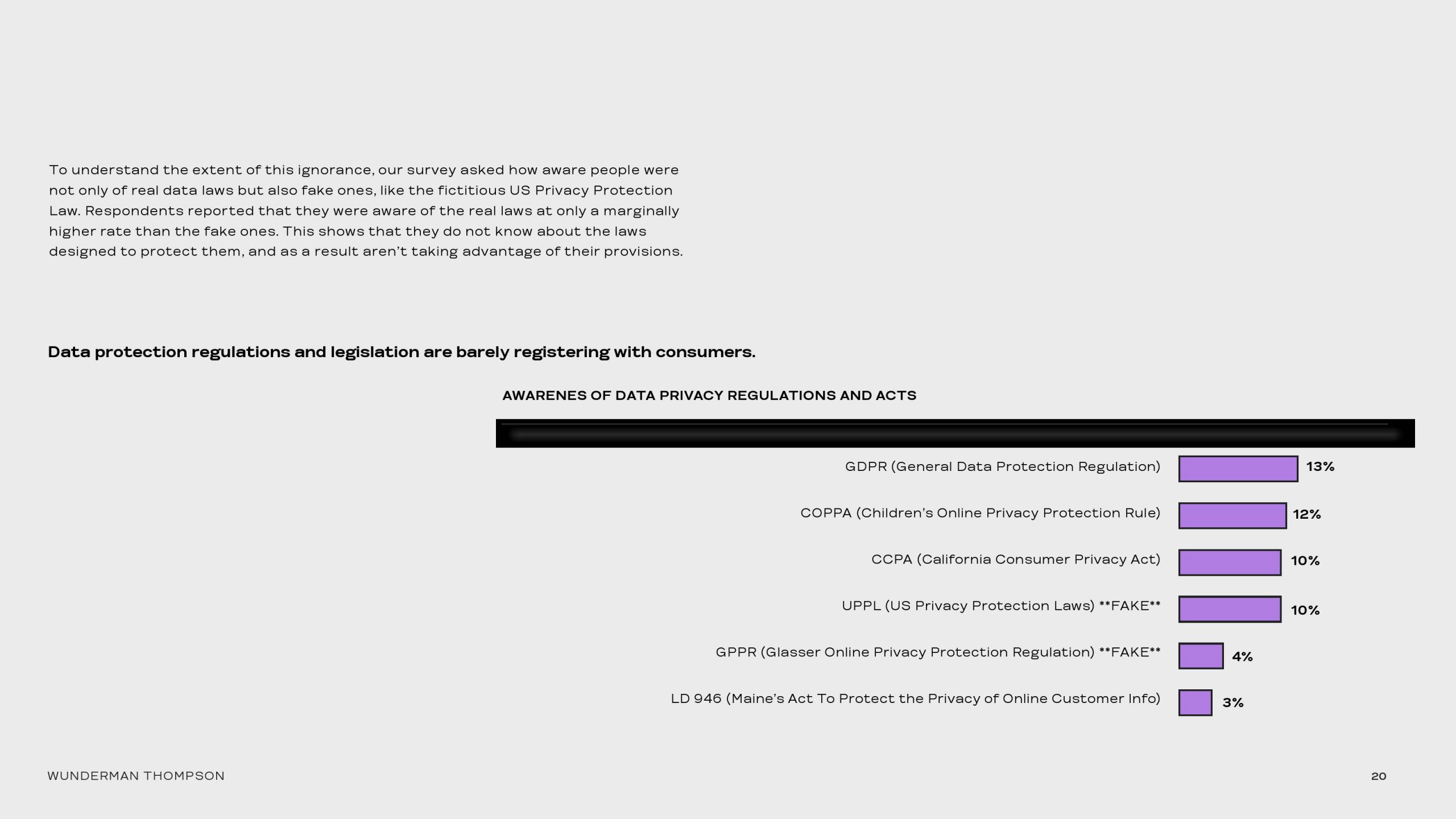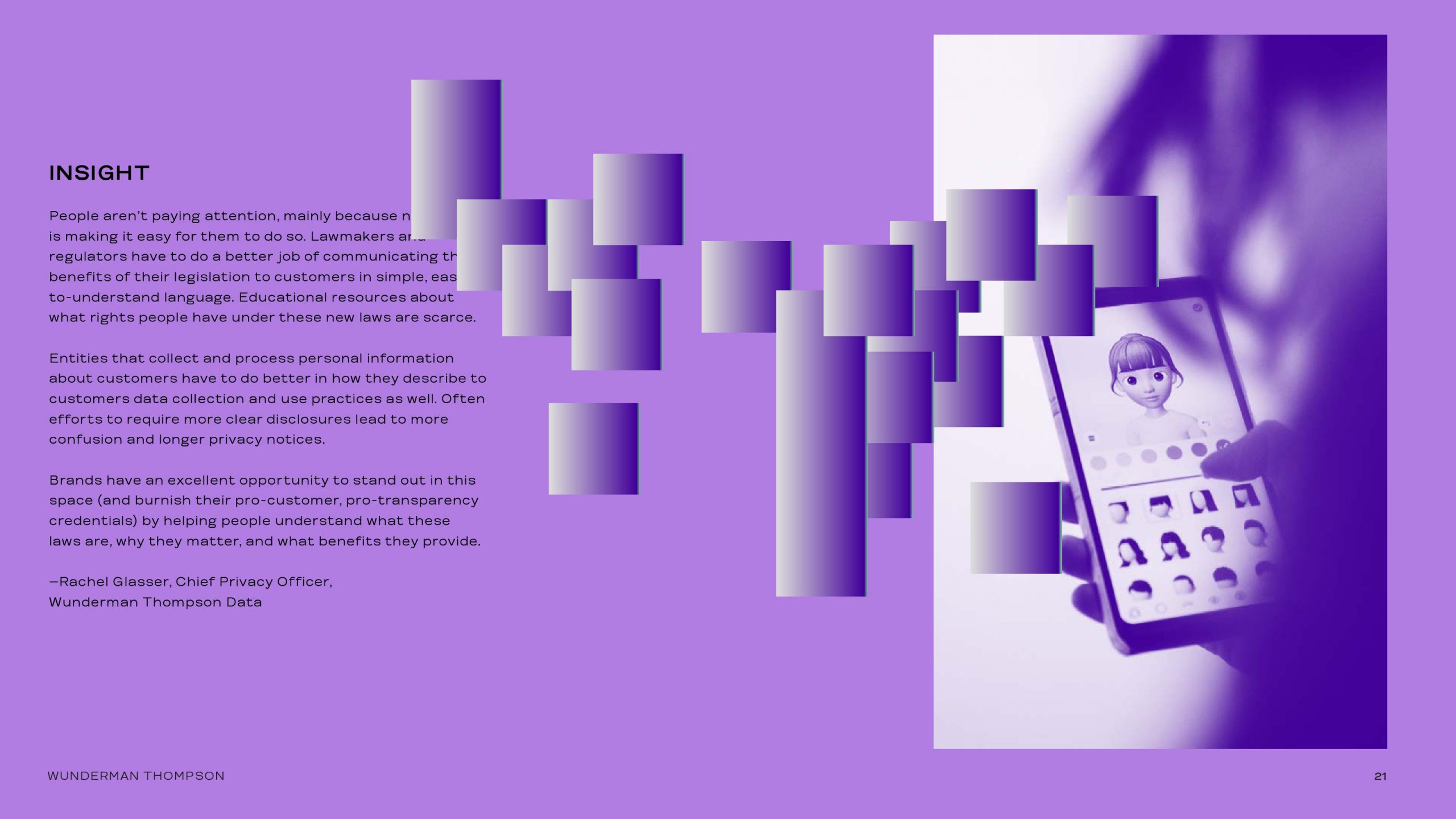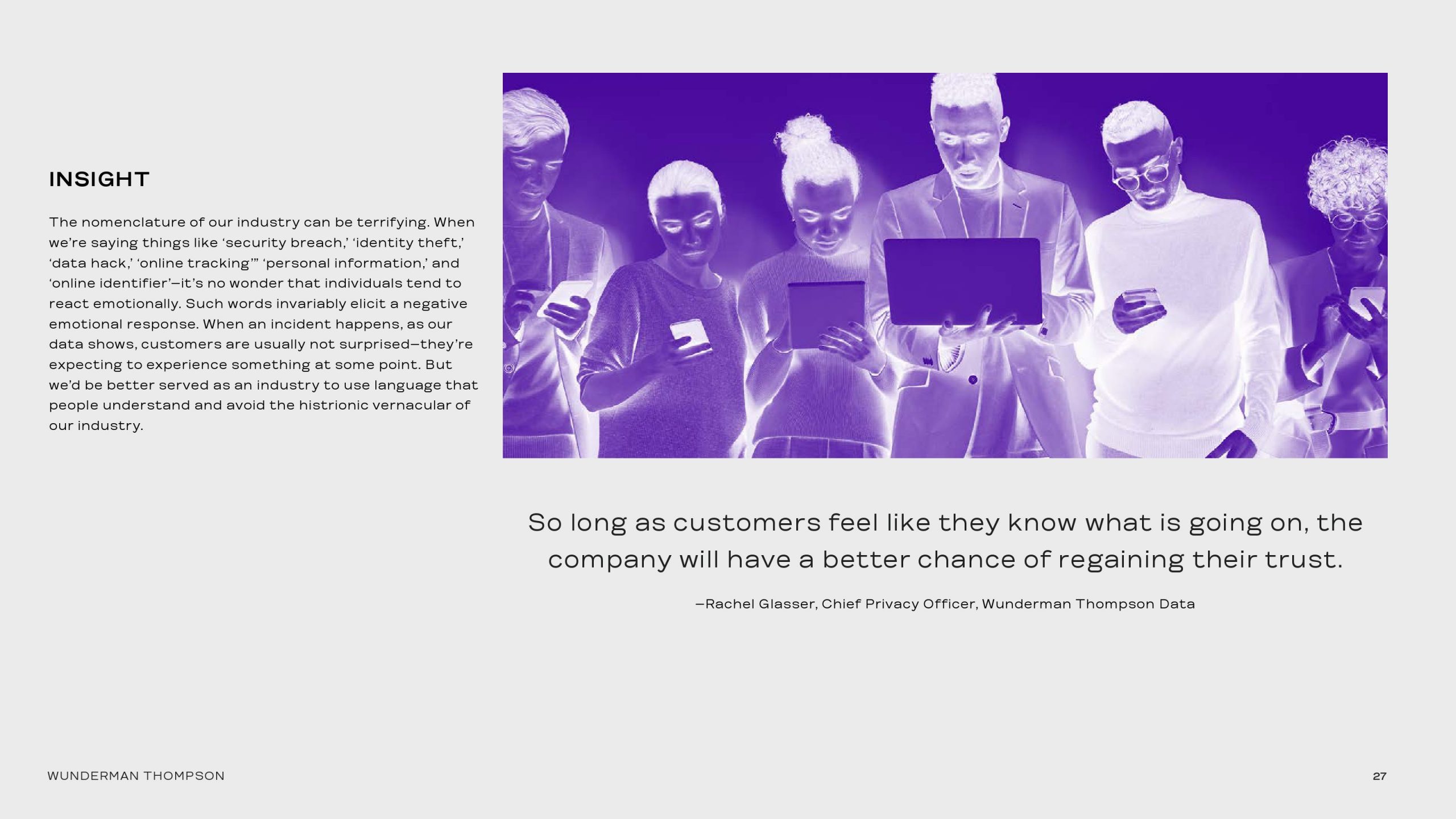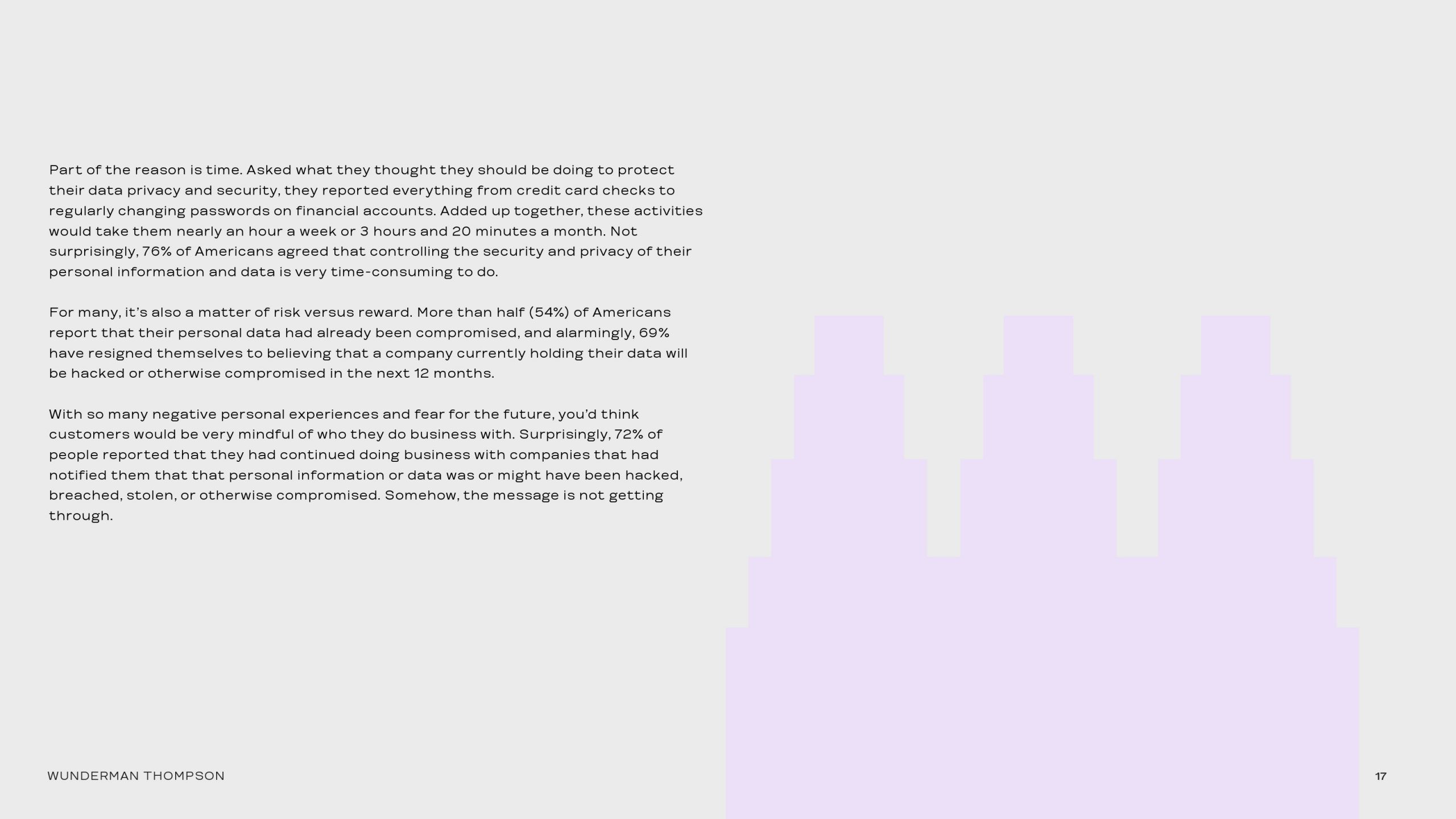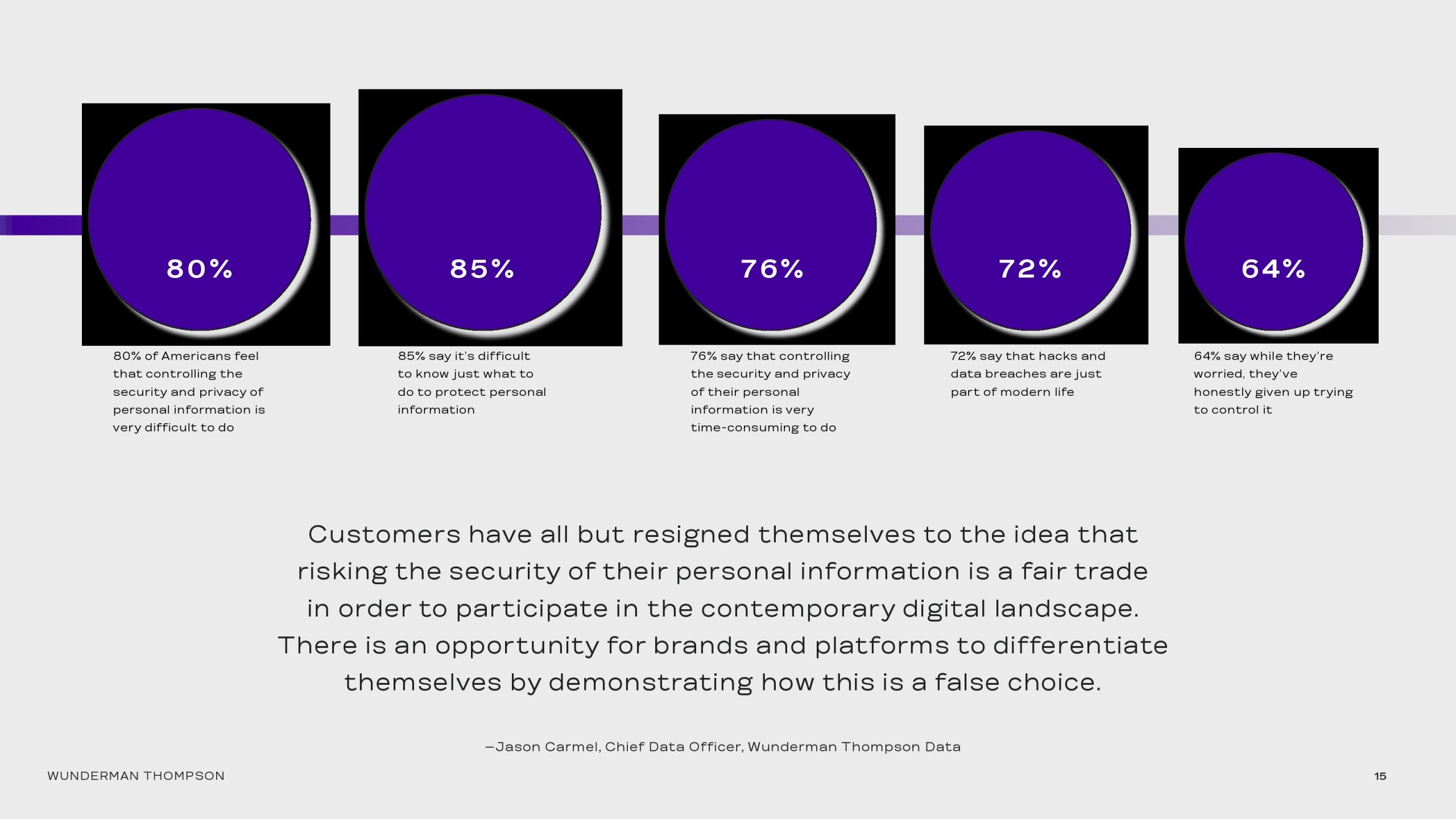 最重要的结果既有见识又令人震惊,并涉及广泛。因此,智威汤逊将其分为两类:客户洞察力和品牌影响力。第一部分是客户对数据隐私的看法,包括详细的结果,见解和关注,希望有助于将品牌推向更加数据安全、透明和自信的环境。第二部分分析了品牌提在新的数字价值交换时代如何优先考虑隐私而不是便利。