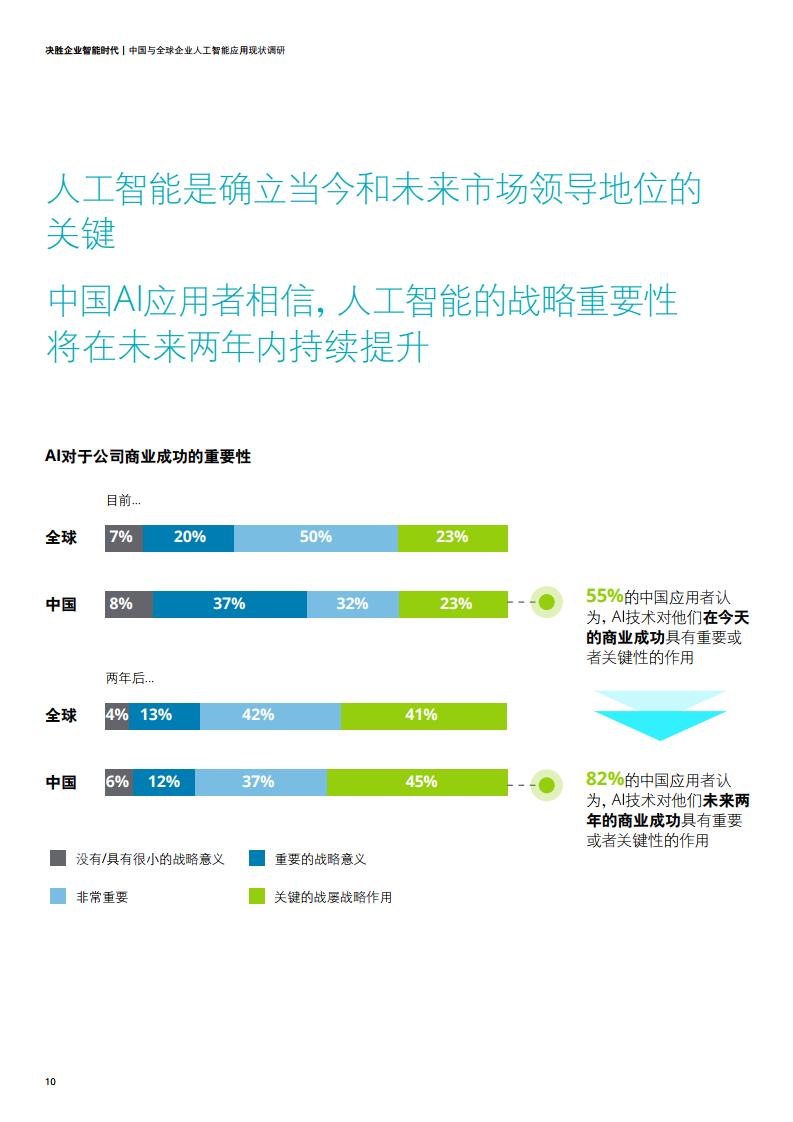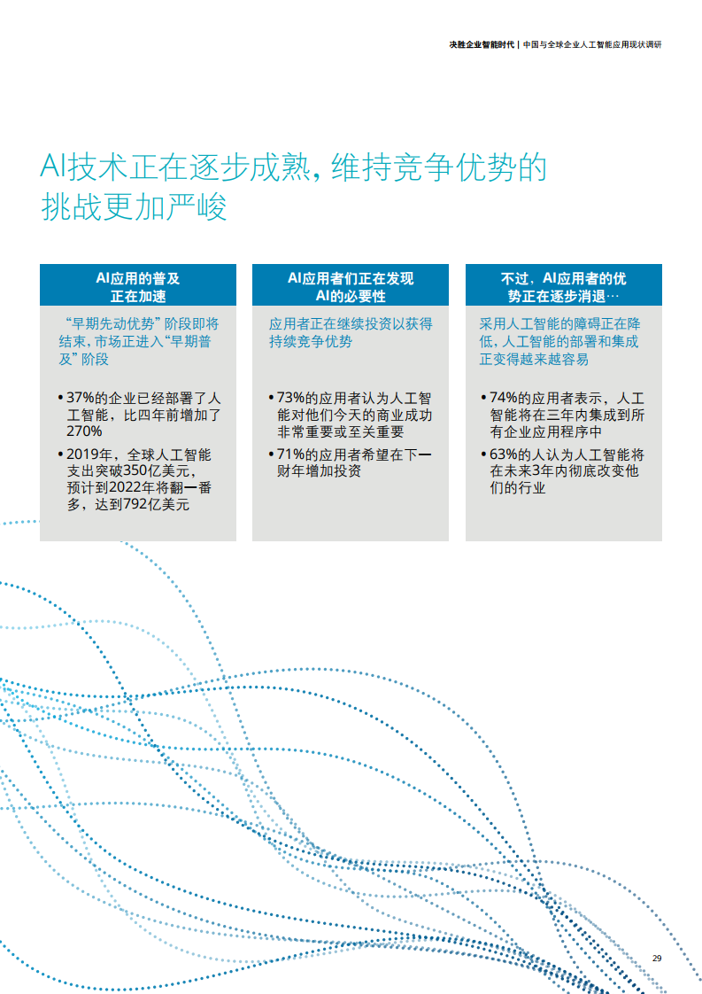 大多数采用人工智能的企业相信,AI将在未来3年内彻底改变他们的组织和行业,但随着人工智能迅速普及,内置人工智能的产品和服务数量日益增长,先行企业所具有的优势将被削弱。