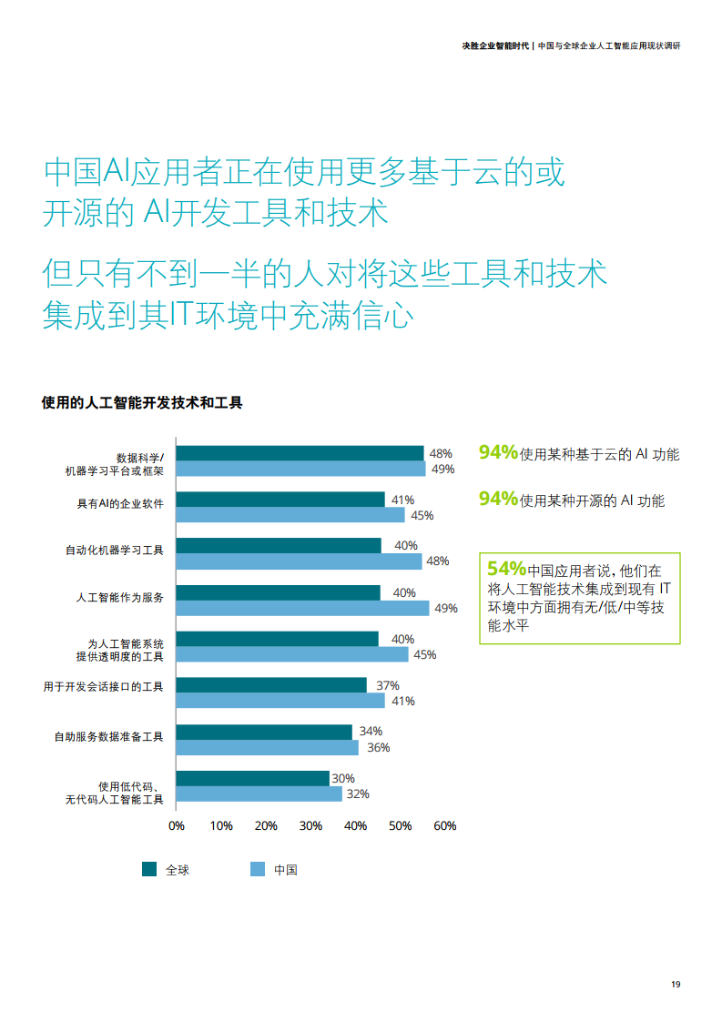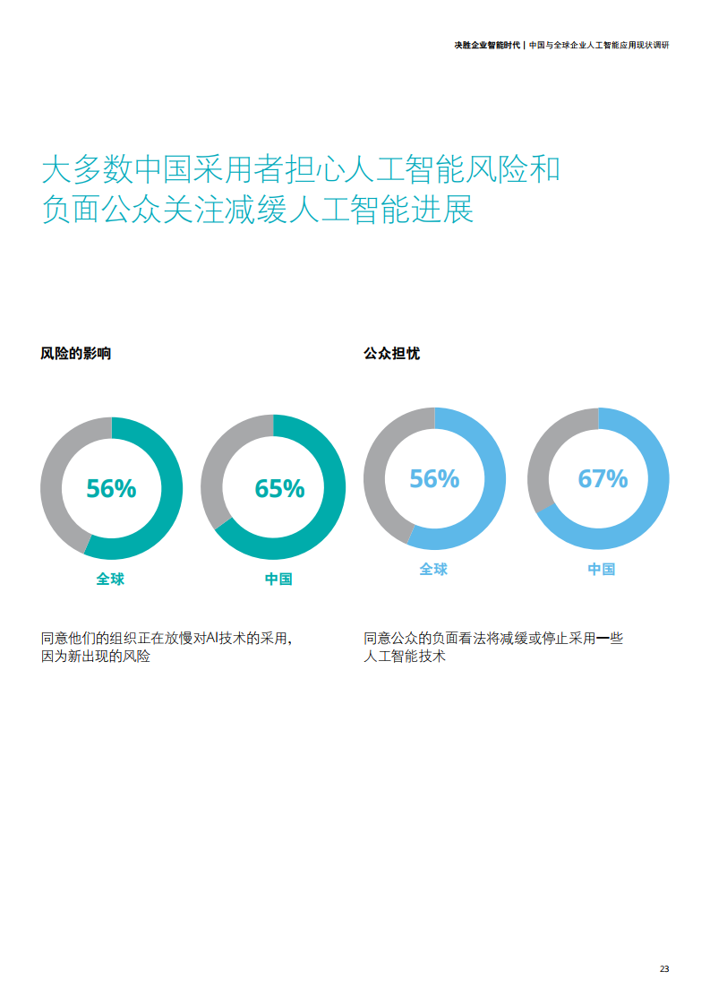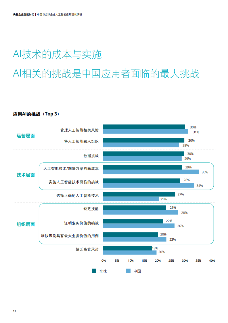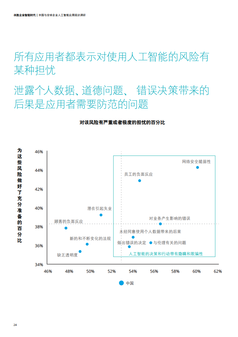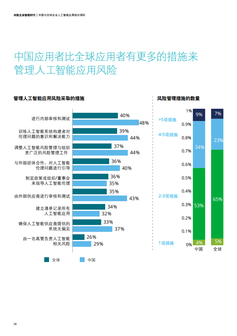AI技术的成本与实施AI相关的挑战是中国应用者面临的最大挑战。大多数中国采用者担心人工智能风险和负面公众关注减缓人工智能进展,相比全球,中国的AI应用者正在采取更多措施积极管理与人工智能应用相关的风险。