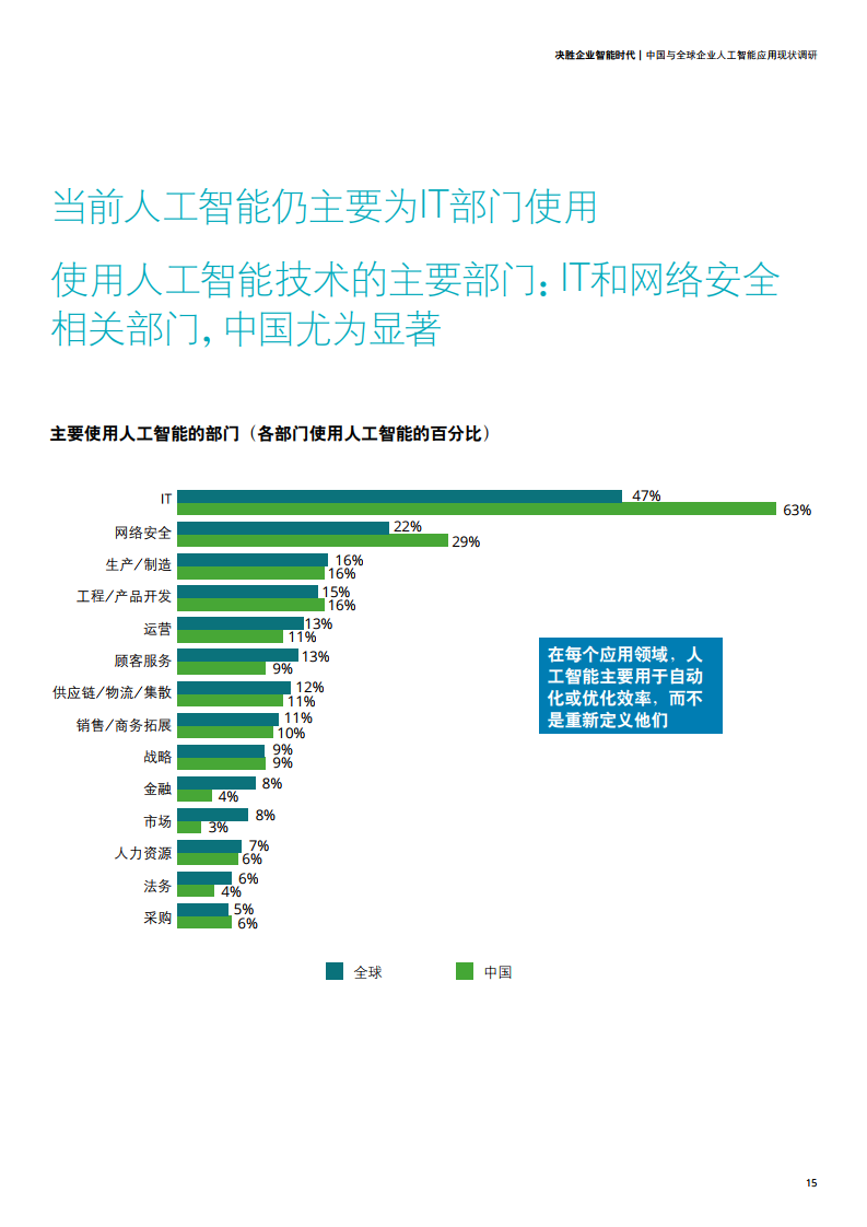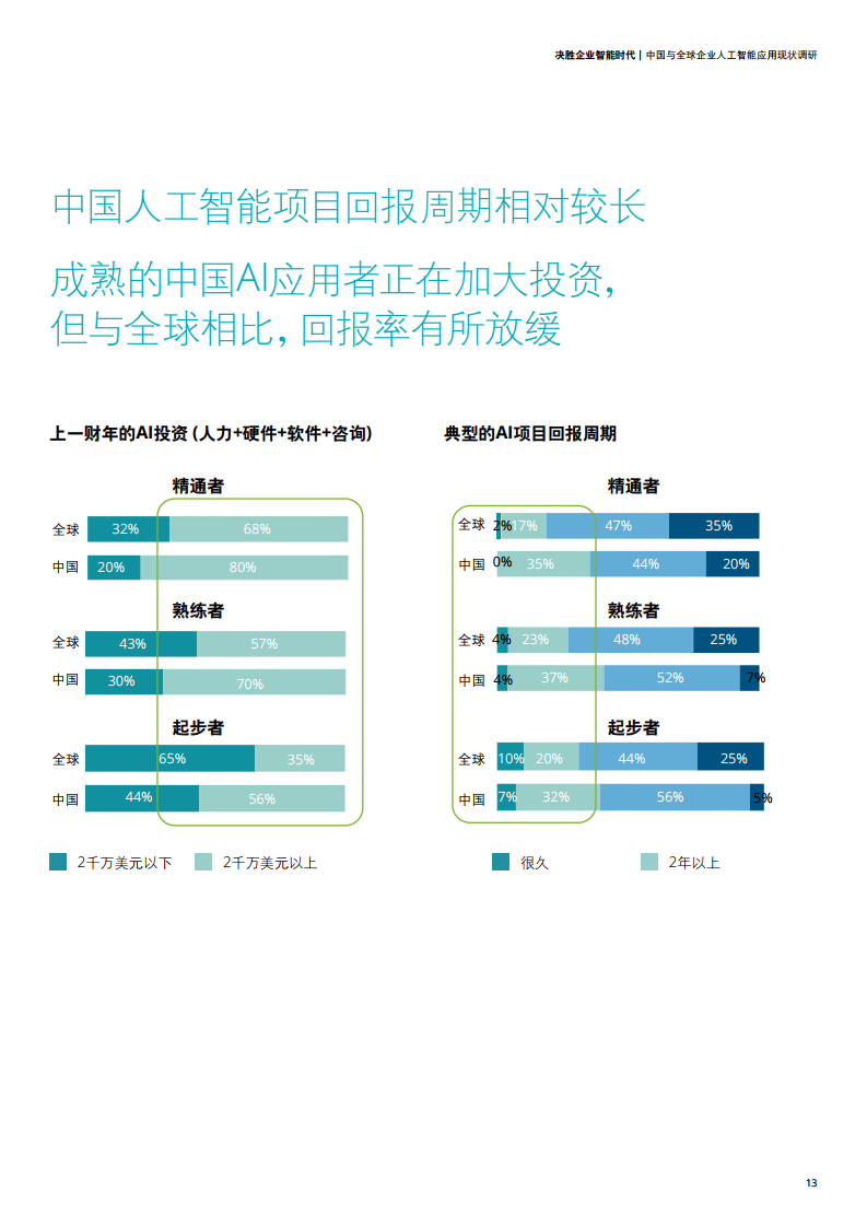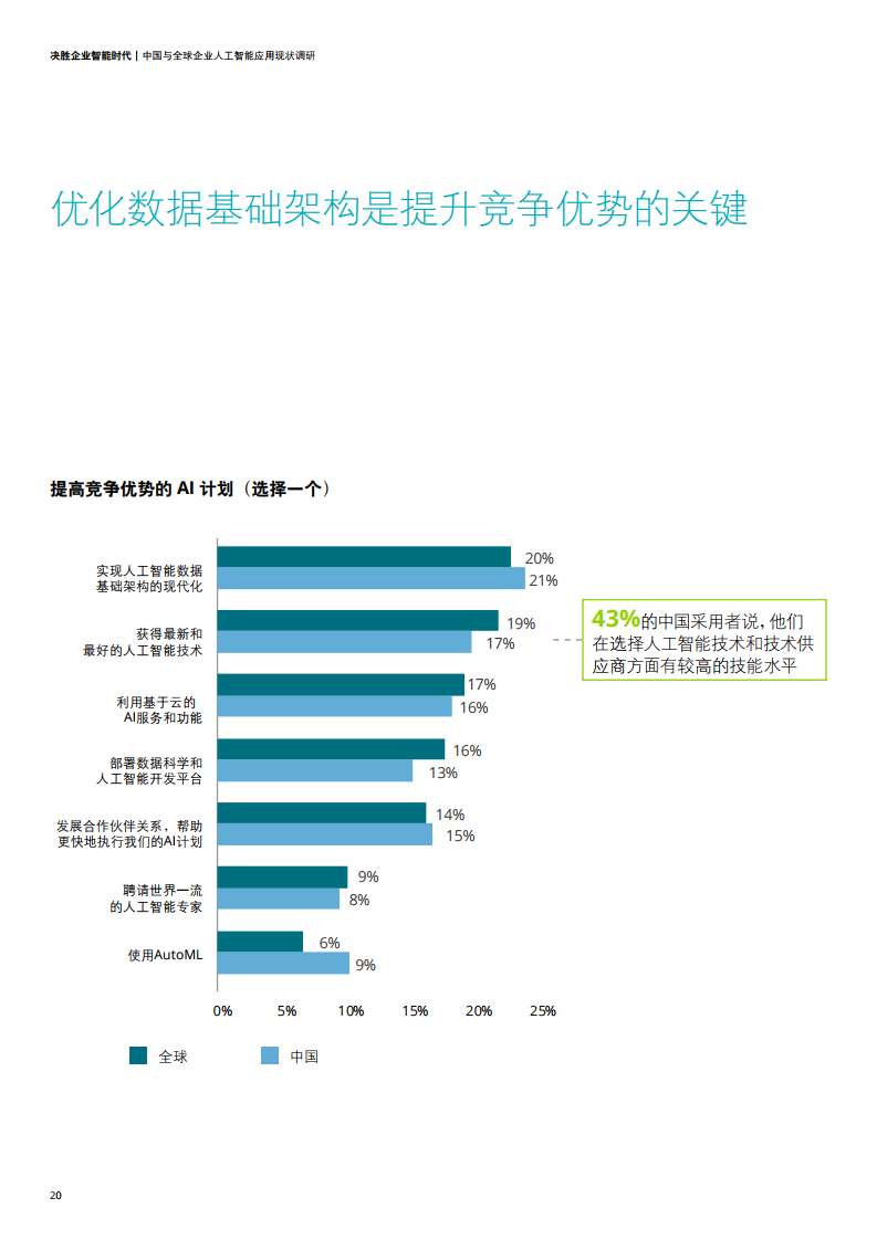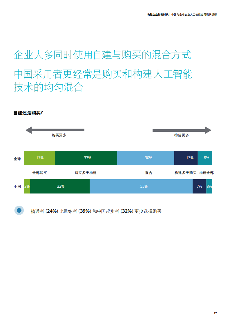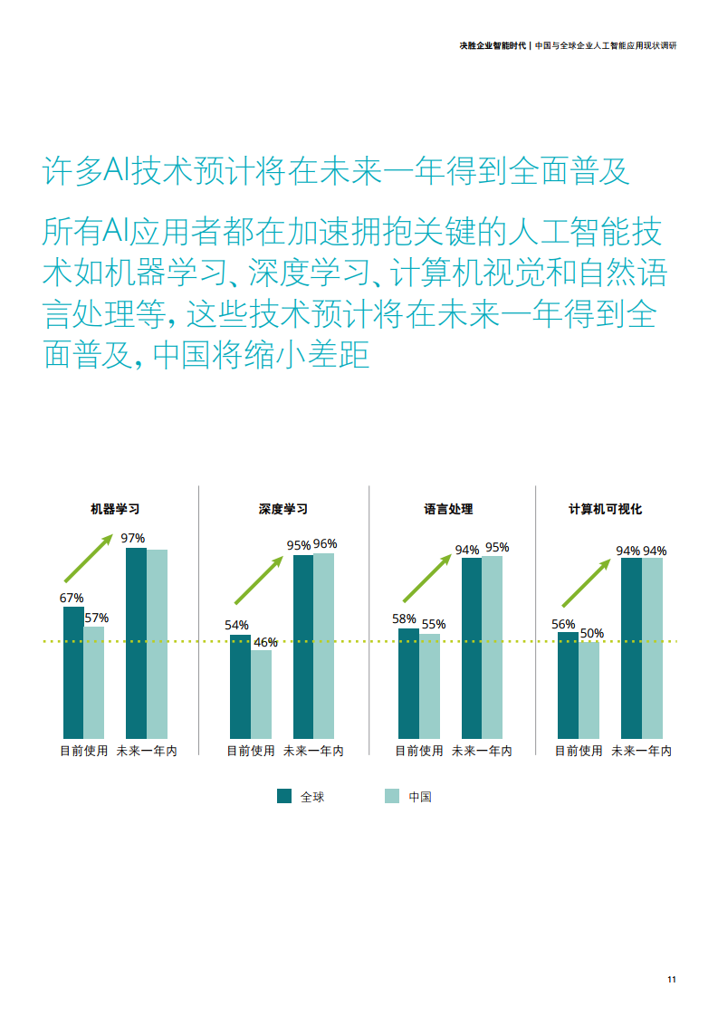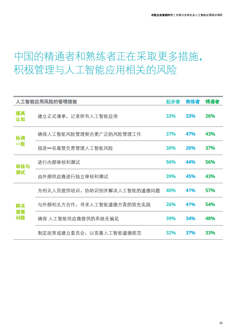 AI技术的成本与实施AI相关的挑战是中国应用者面临的最大挑战。大多数中国采用者担心人工智能风险和负面公众关注减缓人工智能进展,相比全球,中国的AI应用者正在采取更多措施积极管理与人工智能应用相关的风险。