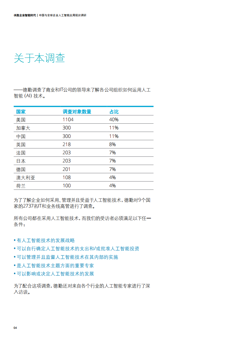 为了了解企业如何采用、管理并且受益于人工智能(AI)技术,德勤对9个国家的2737名IT和业务线高管进行了调查,同时还对来自各个行业的人工智能专家进行了深入访谈,深入获取全球人工智能应用企业对于AI技术的看法和采取的措施,从而提出建议帮助企业在竞争中保持市场领先地位。