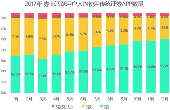 超过90%以上的券商活跃用户只使用一款证券类APP,考虑到对于有投资证券习惯的用户而言,由于转移券商平台的成本较高(开户、入金、银证转账等操作,软件功能的熟悉过程),可能更愿意使用熟悉的平台,因此同时使用多平台的比率不高。