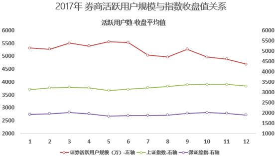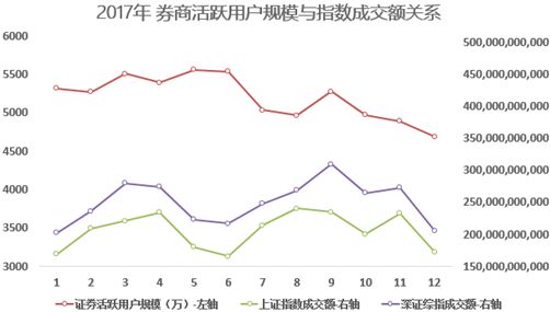 上证指数和深圳综指全年走势基本吻合,都是先抑后扬的态势,年初到5月略有波动,5月后逐渐上扬,年底稍有回落。券商活跃用户规模年初较平缓,5月份开始逐渐减少,9月份开始呈下降趋势,与监管趋严、用户投资热情下降有关。