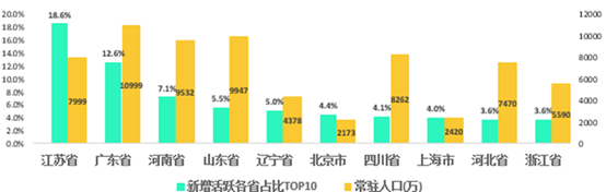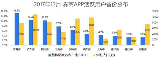 从新增角度来看,用户基数大的江苏和广东也贡献了最多新增活跃用户,而且表现地比整体分布更为集中。未来提升活跃用户规模的重点可以放在券商活跃用户规模占比并不靠前但人口数量巨大的地区,比如四川省、山东省、河北省。