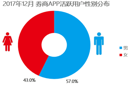 券商活跃用户中男性比率更高,达到57%,女性用户达到43%。