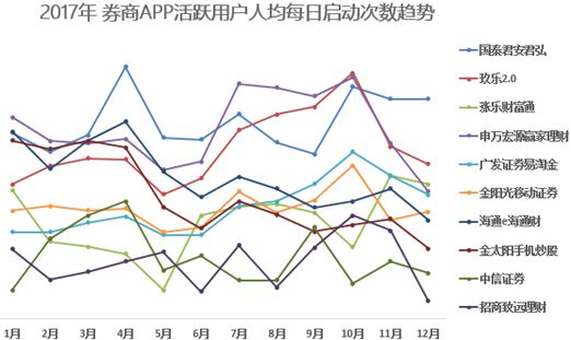 根据数据,各类券商APP启动次数趋势变化较大,交错产生较多,在年底形式逐渐明朗,“国泰君安君弘”处于第一集团,“玖乐2.0”、“涨乐财富通”、“申万宏源赢家理财”、“广发证券易淘金”、“金阳光移动证券”、“海通E海通财”几家较为接近。