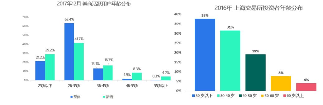 APP整体活跃用户35岁以下用户比率达84.6%,而APP新增活跃用户35岁以下比率为70.9%。作为对比,上交所投资者年龄分布数据中,40岁以下的用户比率为69%,可见APP活跃用户比投资者在年龄上更年轻化。券商APP的用户以年轻人为主,是未来的提供收入的主力人群,因此券商运营APP平台就是对未来投资,占得先机。