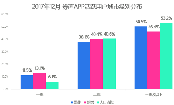 人口占比仅6.1%的一线城市贡献的券商APP整体活跃用户和新增活跃用户占比都超过10%,而二线和三线以下城市的APP整体活跃占比和APP新增活跃占比都要低于人口占比数据,说明证券APP的饱和度一线>二线>三线以下城市。一线城市的用户已经接受了比较充分的券商业务洗礼,今后为了获得用户规模的提升,需要在二、三线城市开展营销活动,想要获得良好的营销效果,最好当下着手了解二、三线城市居民的特点,在未来设计活动时会更有针对性。