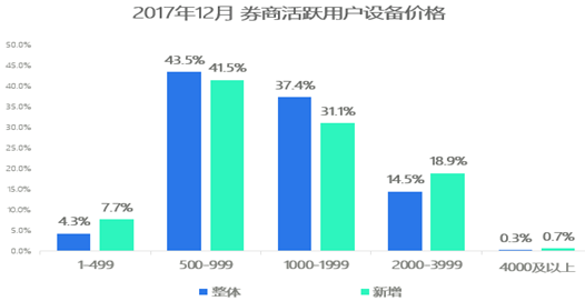 设备价格可以作为衡量用户消费水平的一个参考指标,券商活跃用户多喜欢使用500元-2千元价格区间的设备,整体活跃用户中,该价格区间机型占比达到80.9%,新增活跃用户该类机型占比达72.6%,整体来看,整体活跃用户的设备价格更集中,500元以下和4千元以上机型占比都低于新增活跃用户。