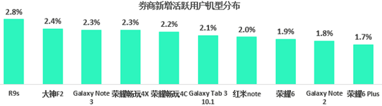 券商活跃用户的设备偏好并不特别集中,没有一款设备占比超过5%。整体活跃用户中,红米note是使用最多的设备,华为的荣耀和Mate系列也有较大份额,前十名的设备属于小米、华为、OPPO、三星四个品牌。新增活跃用户的设备偏好与整体用户略有不同,大神手机表现突出,占据第二名,其余前10席位仍由OPPO、三星、华为、小米等品牌瓜分。