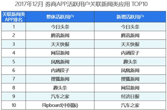 无论券商APP整体活跃用户还是新增活跃用户,今日头条和腾讯(新闻+快报)都占据了前三的位置,表明信息流资讯类APP的头部流量已经被这两家公司占据,整体活跃用户中网易、凤凰、搜狐等传统门户客户端仍占据前列;新增活跃用户中,内涵段子、趣头条的排名较高,与当前用户猎奇、追求有趣的品味相一致。