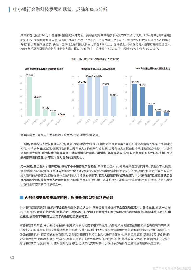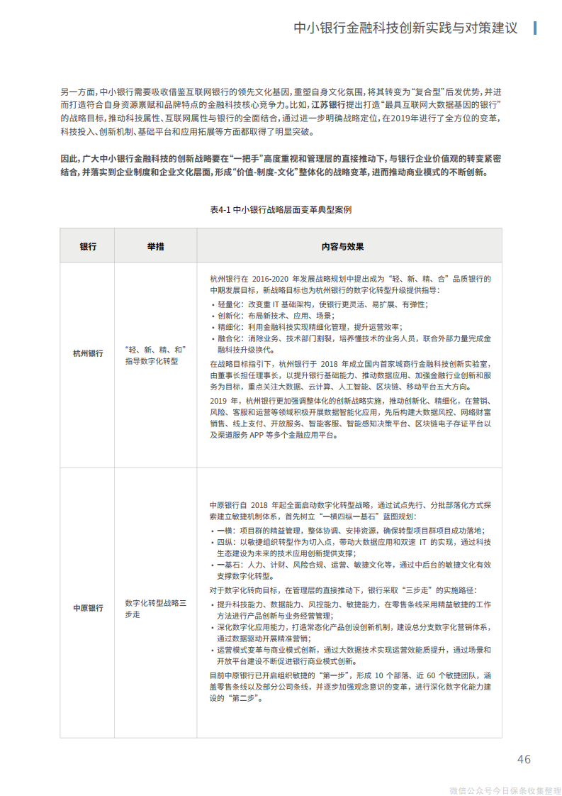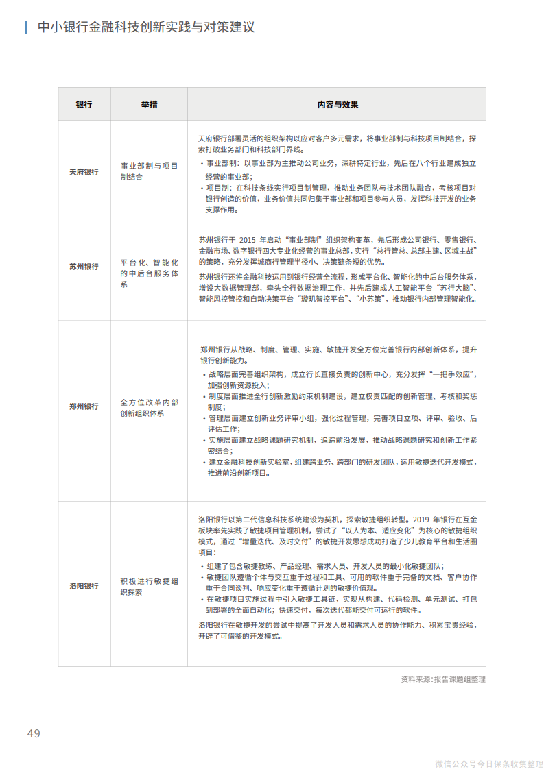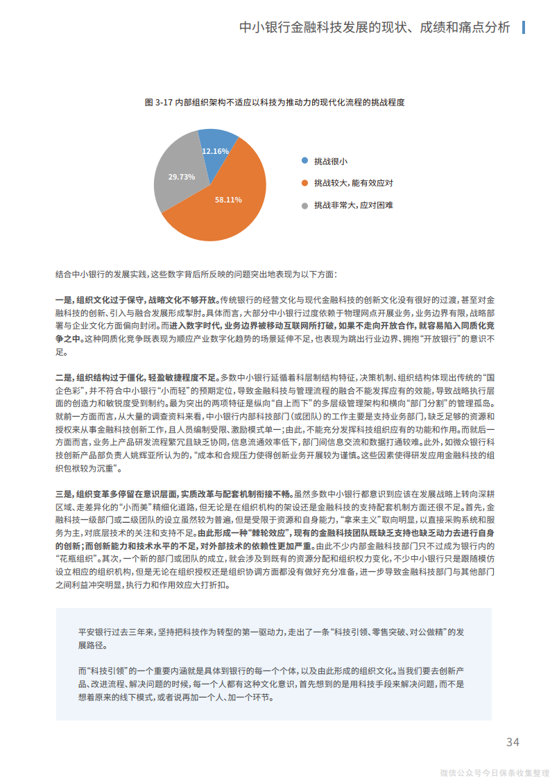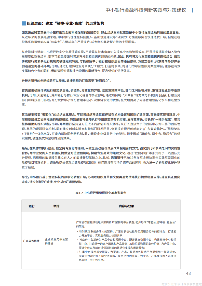 2、在组织层面,管理层、中层和基层员工应当协同推进、整体调整,将文化重塑和组织再造相结合,推动传统银行的繁杂运行机制向“敏捷”组织转变,为建立创新、开放的内外部体系打造适宜的组织机构环境。