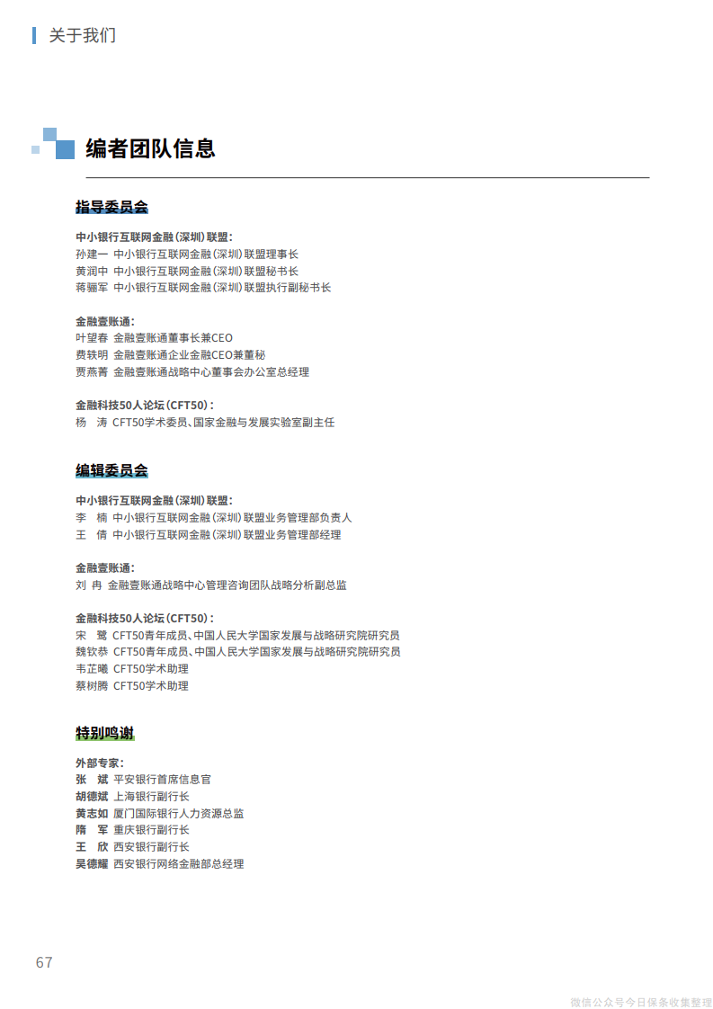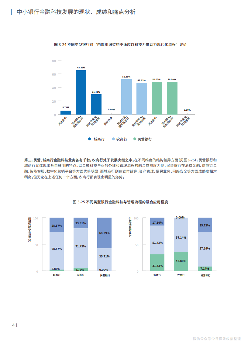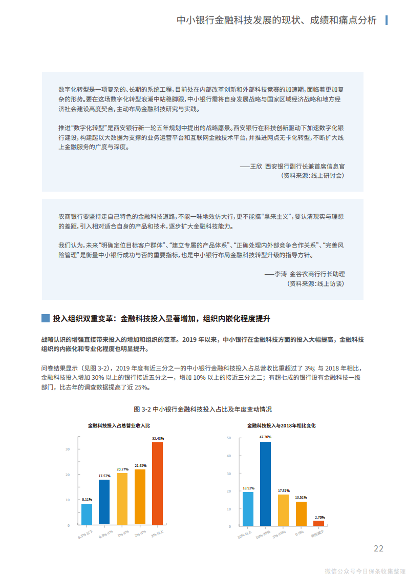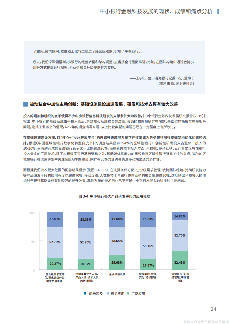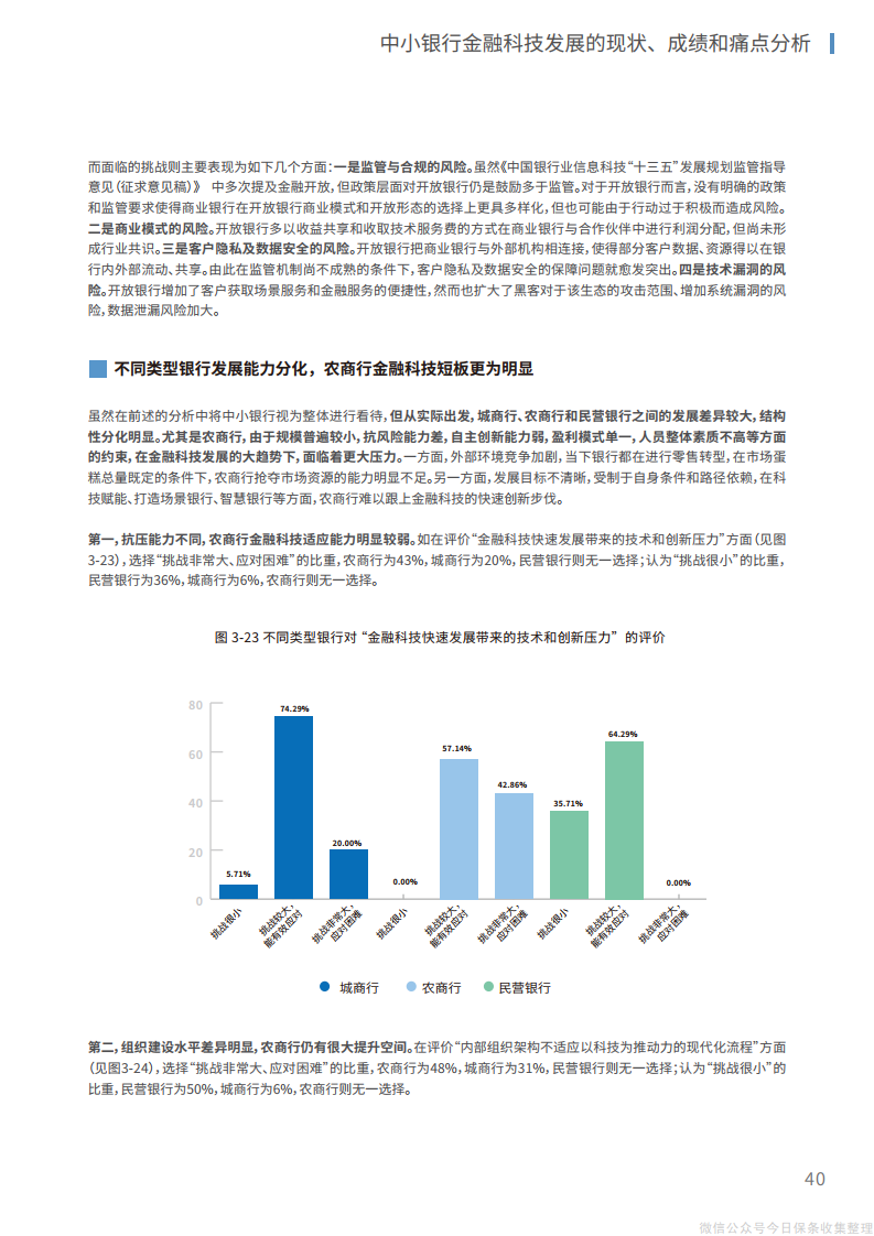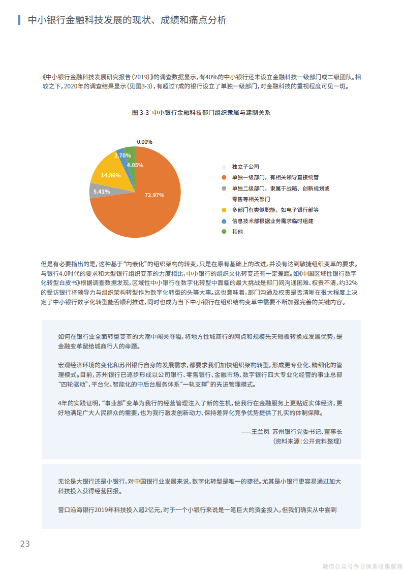 2、在组织层面,管理层、中层和基层员工应当协同推进、整体调整,将文化重塑和组织再造相结合,推动传统银行的繁杂运行机制向“敏捷”组织转变,为建立创新、开放的内外部体系打造适宜的组织机构环境。