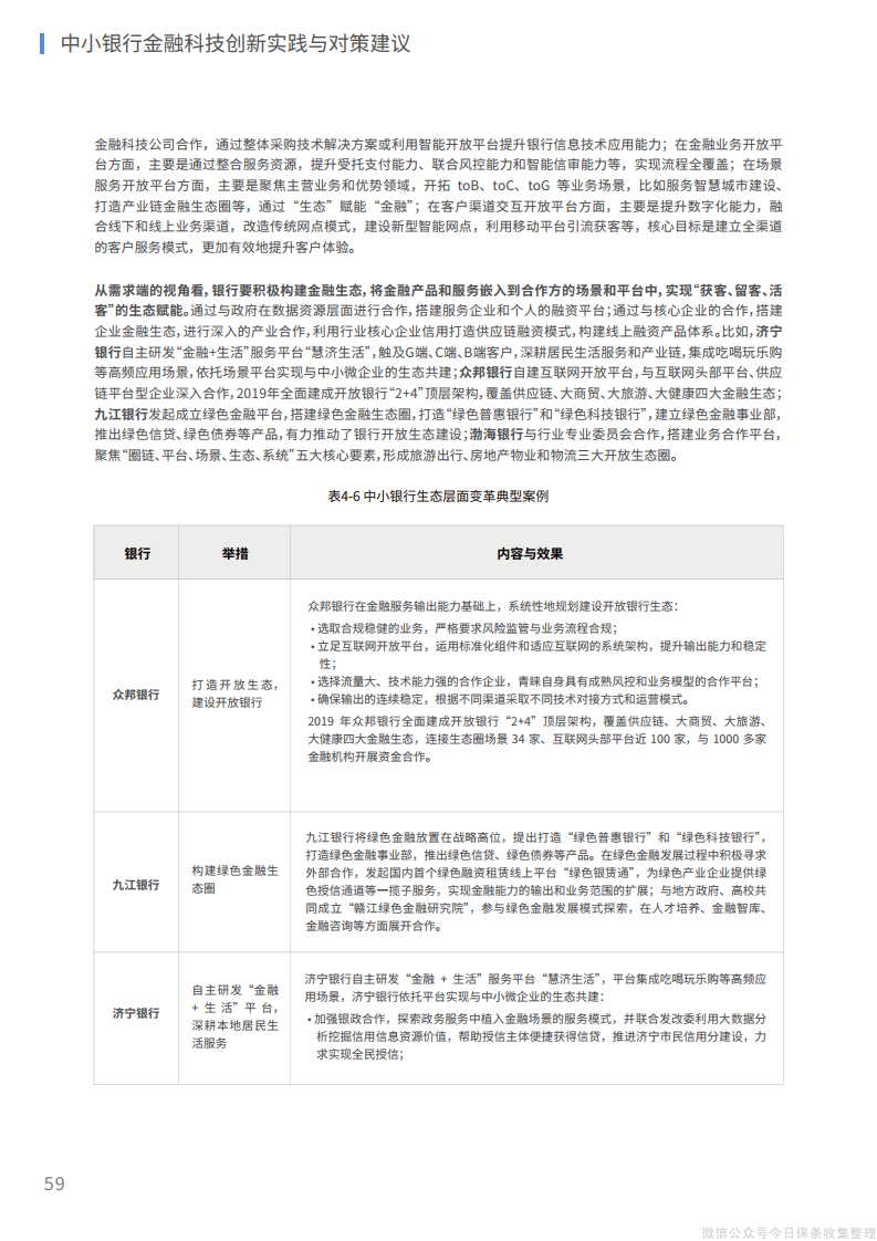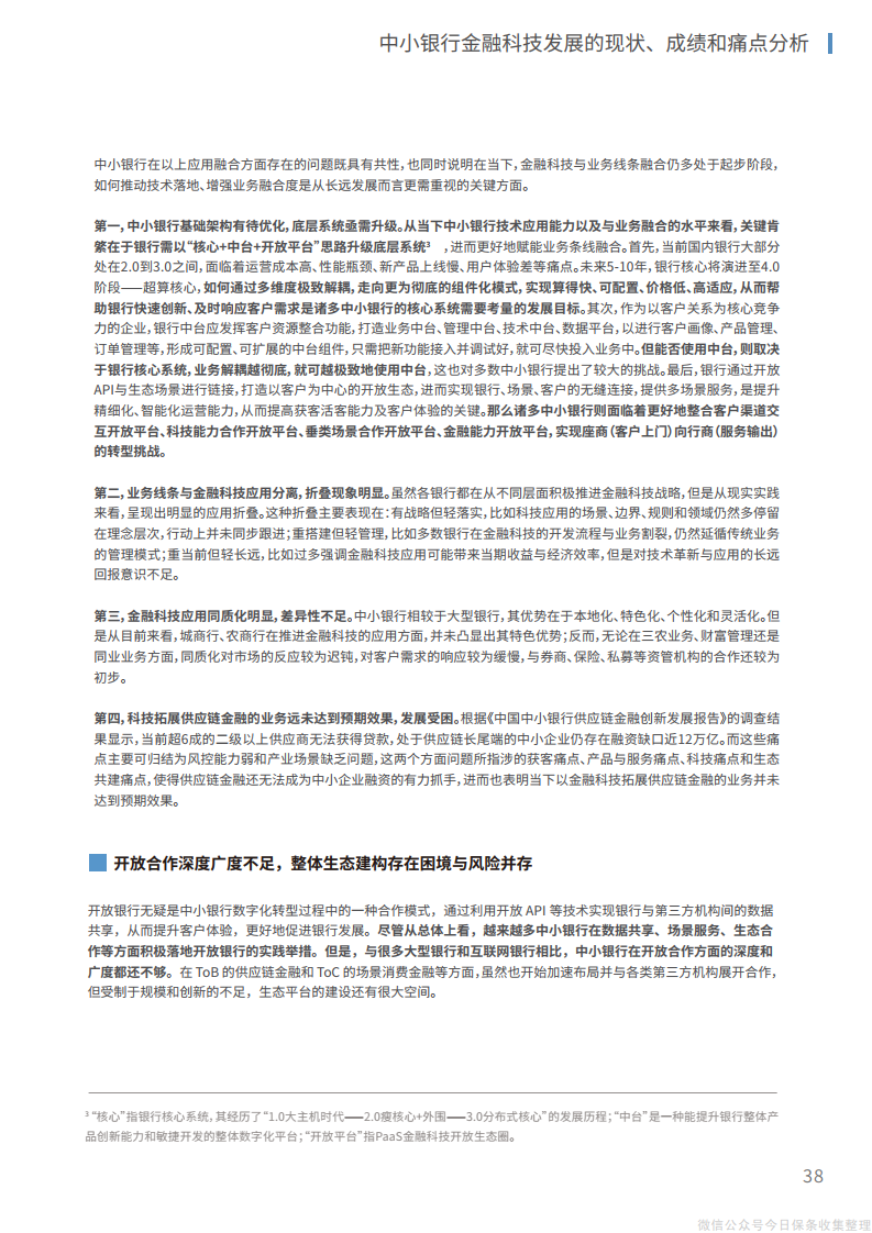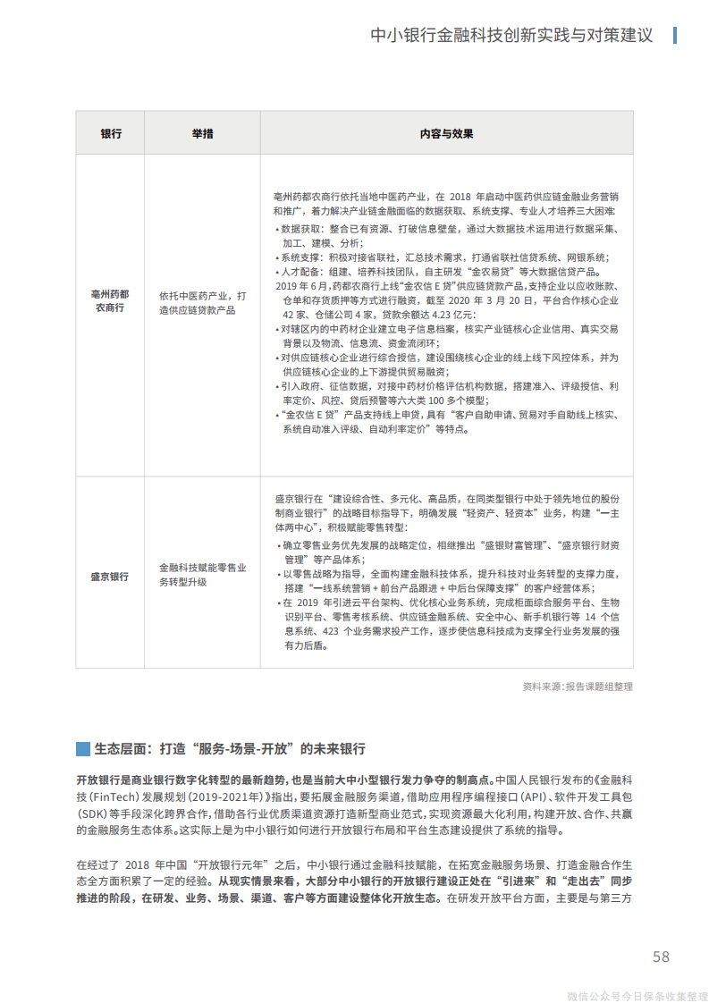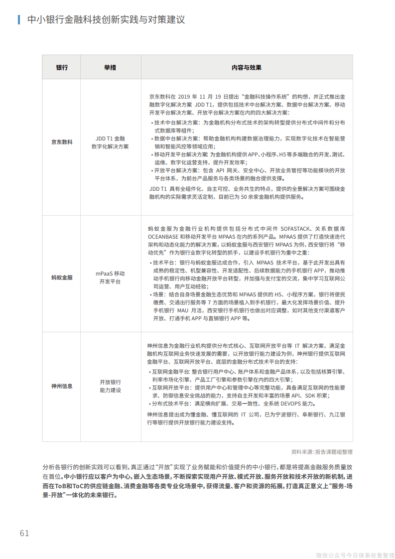 6、在生态层面,在研发、业务、场景、渠道、客户等方面建设整体化开放生态,实现“获客、留客、活客”的生态赋能;从供给端建立与第三方金融科技公司的有效合作模式,在开放平台上形成生态伙伴网络,实现自身科技能力和业务价值的同步提升。