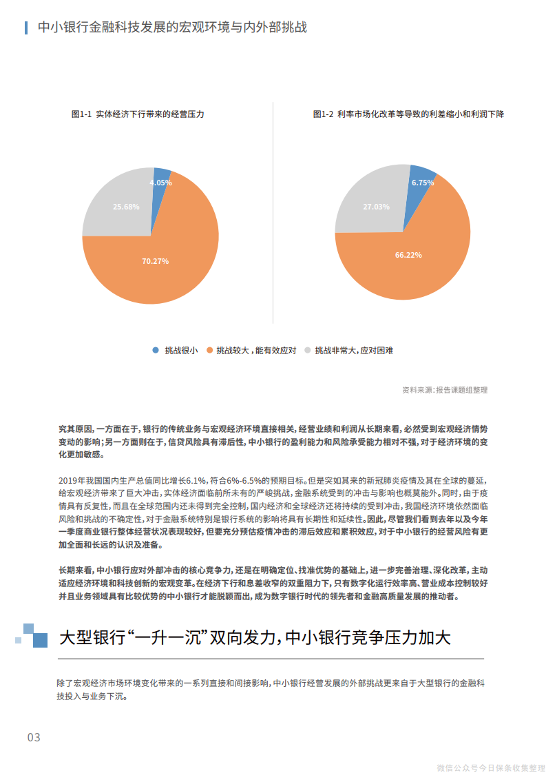 中小银行互联网金融(深圳)联盟联合金融壹账通、金融科技50人论坛于10月26日发布的《中小银行金融科技发展研究报告(2020)》。《报告》指出,一方面,在经济下行和息差收窄的双重阻力下,只有数字化运行效率高、营业成本控制较好并且业务领域具有比较优势的中小银行才能脱颖而出,成为数字银行时代的领先者和金融高质量发展的推动者。另一方面,大型银行“一升一沉”双向发力,中小银行竞争压力加大。