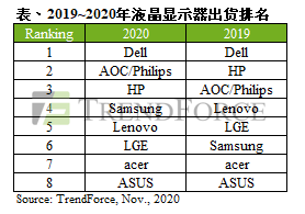 TrendForce集邦咨询分析师王靖怡表示,今年因疫情改变消费型态,许多人转而在家工作及学习,不论自费或是企业补贴款项让员工自行购买,创造出的需求皆反应在消费市场,故相较以商务市场为主的液晶显示器品牌厂,以消费市场为主的品牌厂出货表现更加突出。