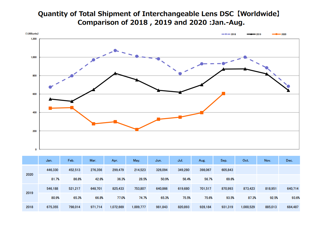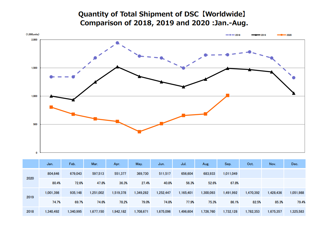 日本相机映像机器工业会(CIPA)周一发布数据称,9月全球数码相机出货量同比减少32%,至101.1万台。降幅比8月缩小,出现复苏迹象,但欧美疫情再次扩大,前景仍然不明朗。