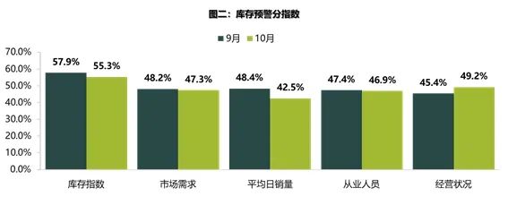 从分指数情况看:10月份库存指数、市场需求指数、平均日销量指数、从业人员指数环比下降,经营状况指数环比上升。