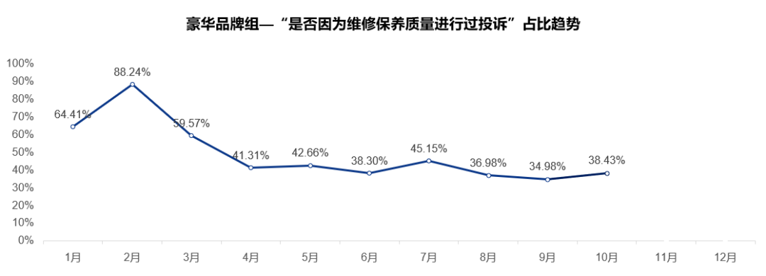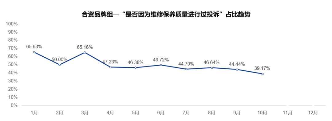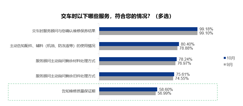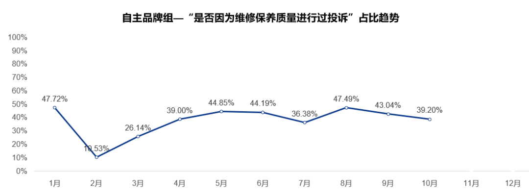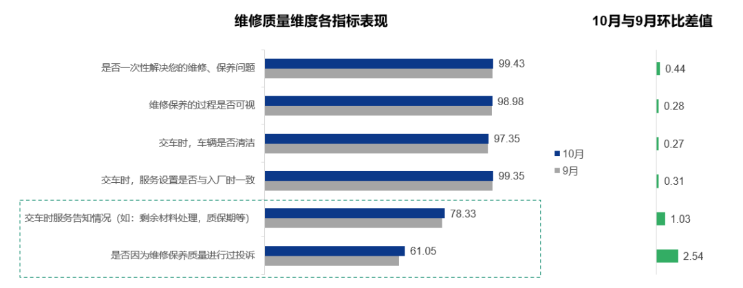 值得一提的是自主品牌组维修质量维度中,“您是否因为维修保养质量进行过投诉”占比,环比9月下降幅度较大,下降3.84%。
