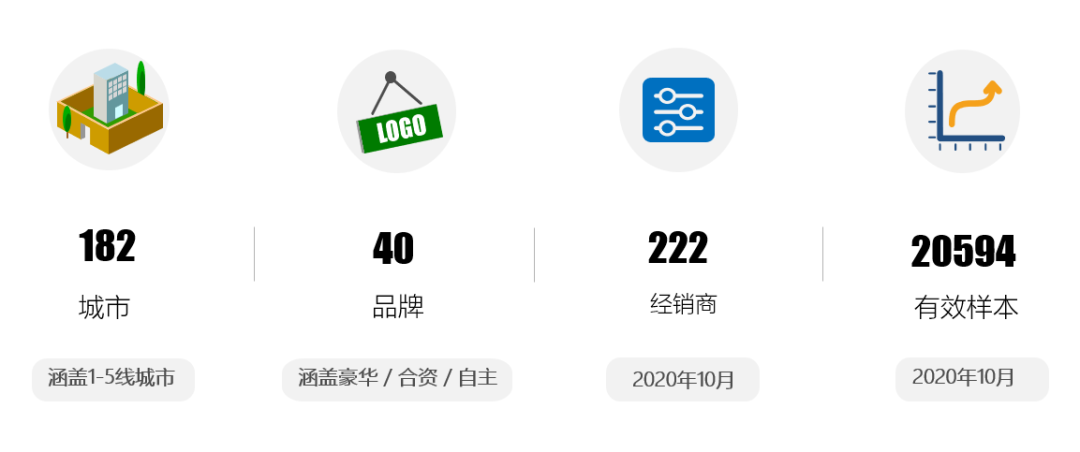 10月“汽车售后服务口碑指数”取样共覆盖182个城市、40个汽车品牌、222家经销商的20594条消费者有效反馈样本。