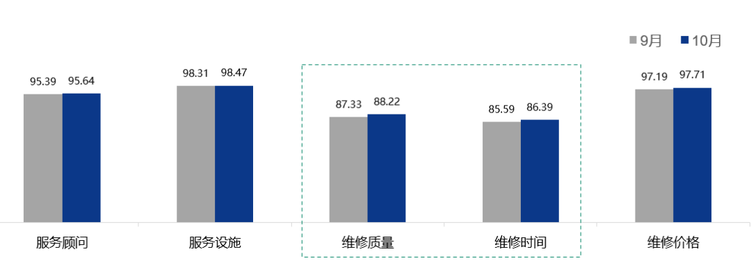 值得关注的是,10月份消费者对售后服务五维度的满意度较上月均有所提升。其中,对维修质量、维修时间的满意度提升明显,环比分别提升0.89分和0.8分。