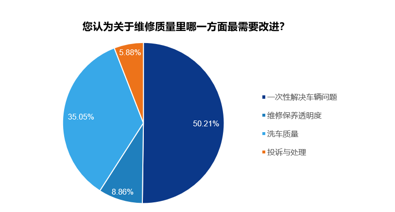 同时,CADA云数聚还对维修质量维度需要改进的环节进行了探查,结果发现,过半的消费者认为一次性解决车辆问题最需要改进,超三成的消费者认为洗车质量需要改进。