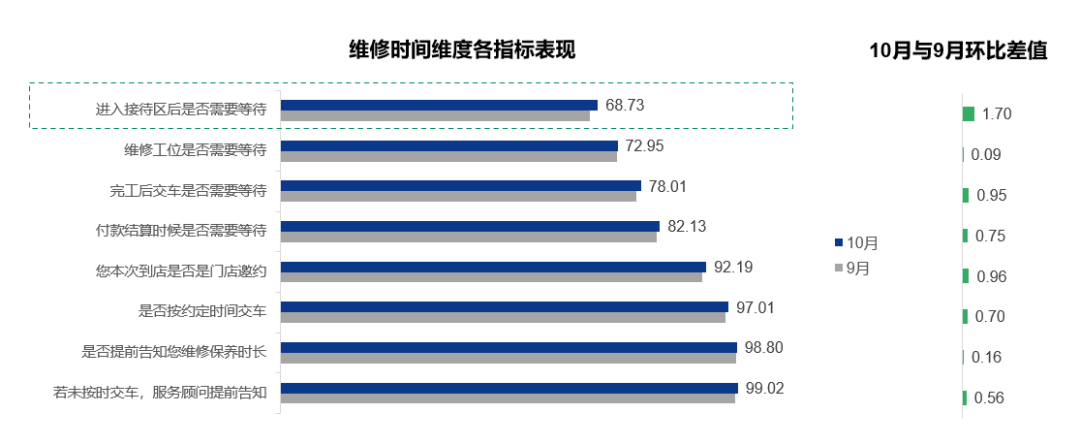 具体来看,消费者对维修时间维度各指标的满意度在10月均实现了环比提升。其中“进入接待区后是否需要等待”提升幅度最大,环比提升1.7分。