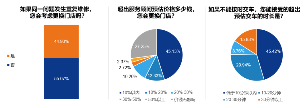 10月中国汽车消费者口碑指数还对汽车售后服务过程中的“如果同一问题发生重复维修”“无增项的情况下,超出预估价格多少钱,您会更换门店”以及“不能按时交车时,您能够接受的超出预估交车时长”三个关键性指标进行了分析。