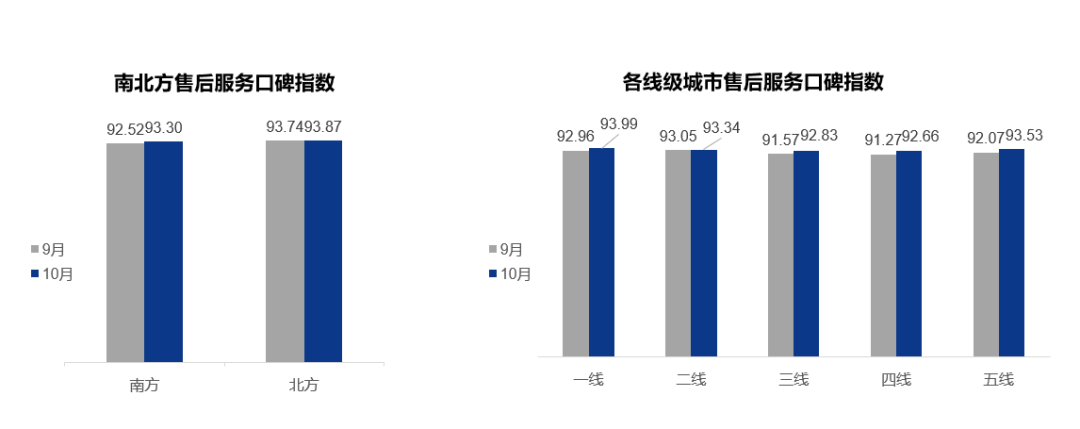 《报告》显示,10月南北方售后服务口碑指数分别为93.30分和93.87分,相差0.67,南北方消费者对汽车售后服务满意度的差距继续缩减。