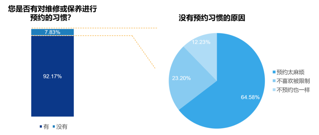 再对没有预约习惯的消费者进一步探查发现,其中64.58%的消费者是认为“预约太麻烦”,除此之外,表示不愿意预约是因为“不喜欢被限制”和“不预约也一样”,占比分别为23.20%和12.23%。