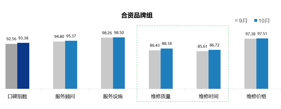 值得一提的是,10月份消费者对合资品牌组售后服务五维度的满意度都有不同程度的提升。其中,消费者对维修质量、维修时间的满意度提升较明显,分别为1.75分和1.11分。本月合资品牌组投诉率下降也较明显,环比下降5.27%。