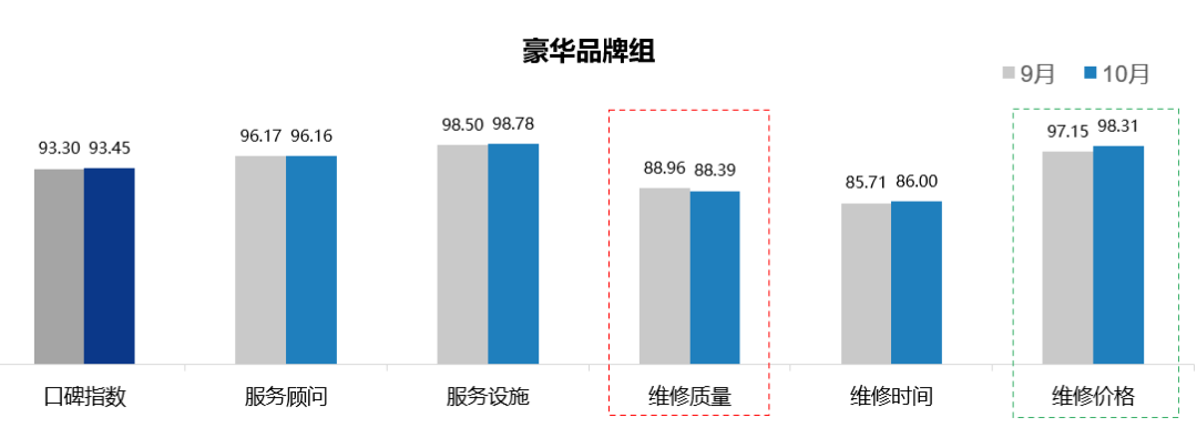 从2020年10月各汽车品牌组售后服务消费者口碑指数来看,豪华品牌组得分为93.45分,环比9月提高0.15分;合资品牌组得分为93.38分,环比提升0.82分;自主品牌组得分为92.88分,环比下降0.03分。