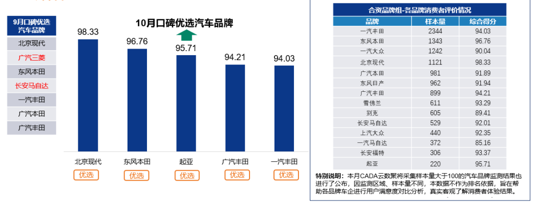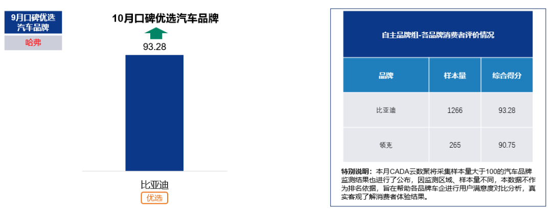 《报告》显示,10月共有11个汽车品牌成为消费者口碑优选汽车品牌,口碑优选汽车品牌数量较9月减少1个。