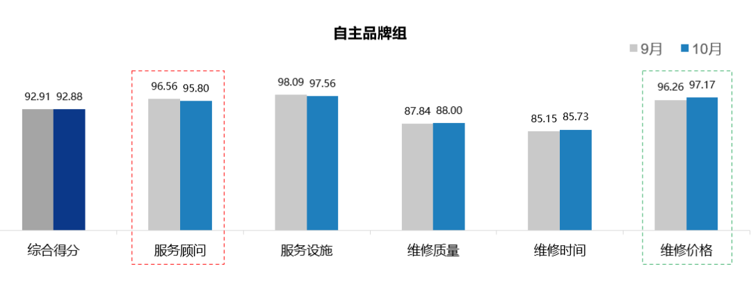 值得关注的是,消费者对自主品牌组服务顾问、服务设施的满意度环比均有所下降。其中,对服务顾问的满意度下降最为明显,环比下降0.76分。而对维修质量、维修时间、维修价格的满意度环比提升,其中维修价格维度提升最明显,环比提升0.91分。