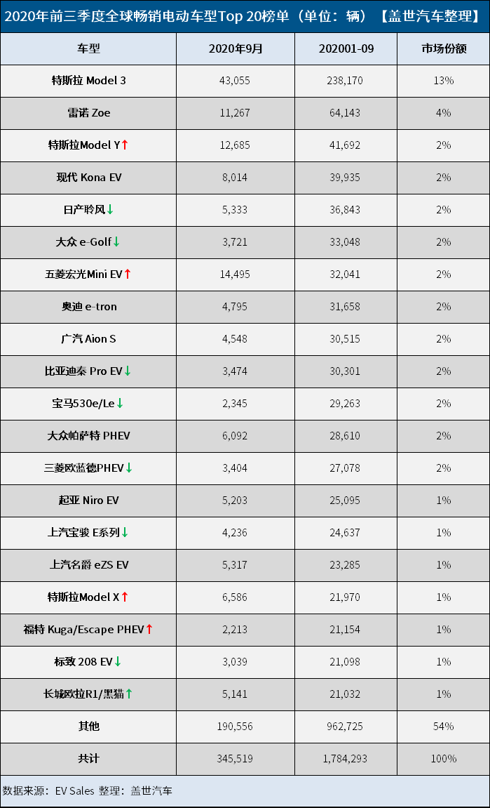 另外,有两款车型重新跻入榜单,特斯拉Model X受益于季度末的交付高峰期,9月共售出6,586辆汽车(自2018年12月以来最好的月度销量成绩),也使其前三季度累计销量排名上升到第17名,从而使特斯拉有三款车型上榜;而长城欧拉R1(现称为黑猫)再次跻身榜单,排在第20名。