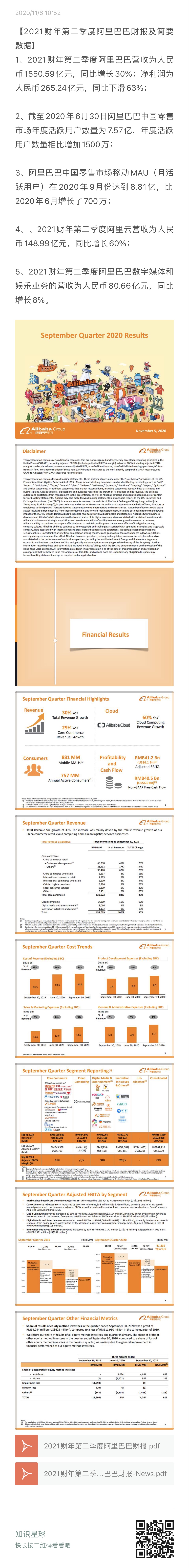 阿里巴巴(NYSE:BABA)今日发布了截至2020年9月30日的2021财年第二季度财报(注:阿里巴巴财年与自然年不同步,从每年的4月1日开始,至第二年的3月31日结束),营收为人民币1550.59亿元(约合228.38亿美元),同比增长30%。净利润为人民币265.24亿元(约合39.07亿美元),与上年同期的人民币707.48亿元下滑63%。不按美国通用会计准则计算,净利润为人民币470.88亿元(约合69.35亿美元),与上年同期的人民币327.50亿元相比增长44%。