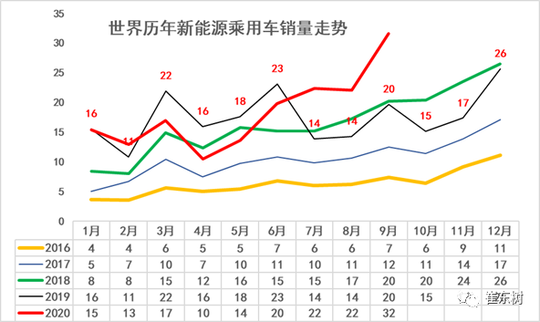 l2020年世界新能源车走势前低后高明显。1-6月降15%,7-9月增58%。10-12月的增量潜力巨大。