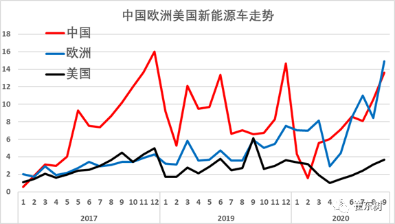 20年2季度的欧洲新能源市场低迷,较19年份额基本持平。近期中国新能源乘用车的增速弱于世界平均增长速度,20年中国新能源乘用车世界份额较大反转,1季度低迷,2季度反转,3季度暴涨。。