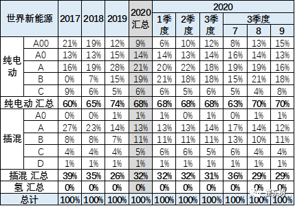 近几年的纯电占比持续提升,但2020年插混表现较强。世界新能源车的20年插混总销量占比是323%。而纯电动的占比达到68%。