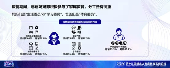 关于家庭分工,调研数据显示,疫情前大部分中国家庭由妈妈们主要负责孩子的学习,但是在疫情期间,妈妈主要做孩子的生活委员和孩子的学习委员,而爸爸也承担了一个非常重要的角色——体育委员。
