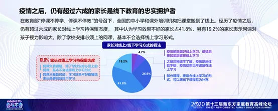 本次调研发现,仍有超过6成的家长是线下教育的忠实粉丝。其中有40%的家长认为,一旦能够恢复到线下教学,“我会坚定不移的恢复回去”;而有20%左右的家长认为,“如果有机会,我仍然会选择线下,线上同时保留,但是我不会放弃线下教学这个模式”。