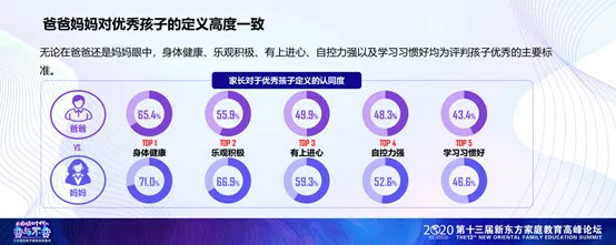 同时,我们也看到爸爸妈妈对于优秀孩子的定义在这次调研中高度一致,大家共同认为身心健康、乐观积极、有上进心、自控力强、学习习惯好这些因素才是评价一个孩子是否优秀的标准。