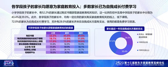 从网上去找公众号、文章,去找亲朋好友、和其他父母聊天,甚至购买书籍,去网上学习,去购买线下课程、购买线上课程,利用短视频学习,这些都是家长获取家庭教育知识的方式。 并且各个学龄段的家长,都愿意为自己学习家庭教育、提高自己的育儿理念进行投入,大多数家长已经在为自我成长付费。