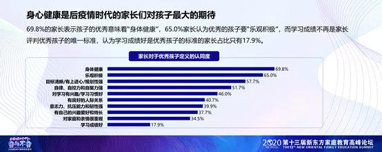 这段时间的经历,让每一个人都会重新审视自己对孩子的教育、重新审视亲子关系。 我们乐观的发现,通过这次调研每一个家长都给了我们很大的信心,大部分家长认为,一个优秀孩子的标准,已经不再是简简单单的学业成绩优秀,更重要的是他的身心健康。